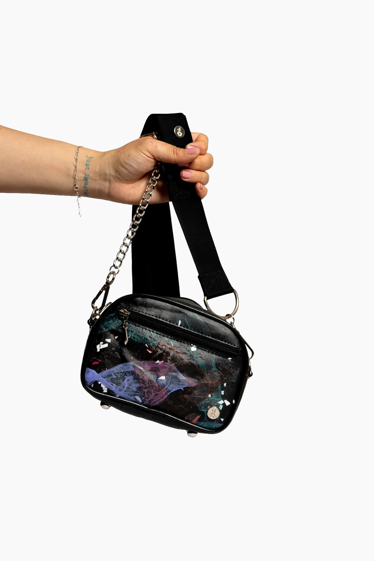 – Herrajes metálicos niquelados tono plateado.